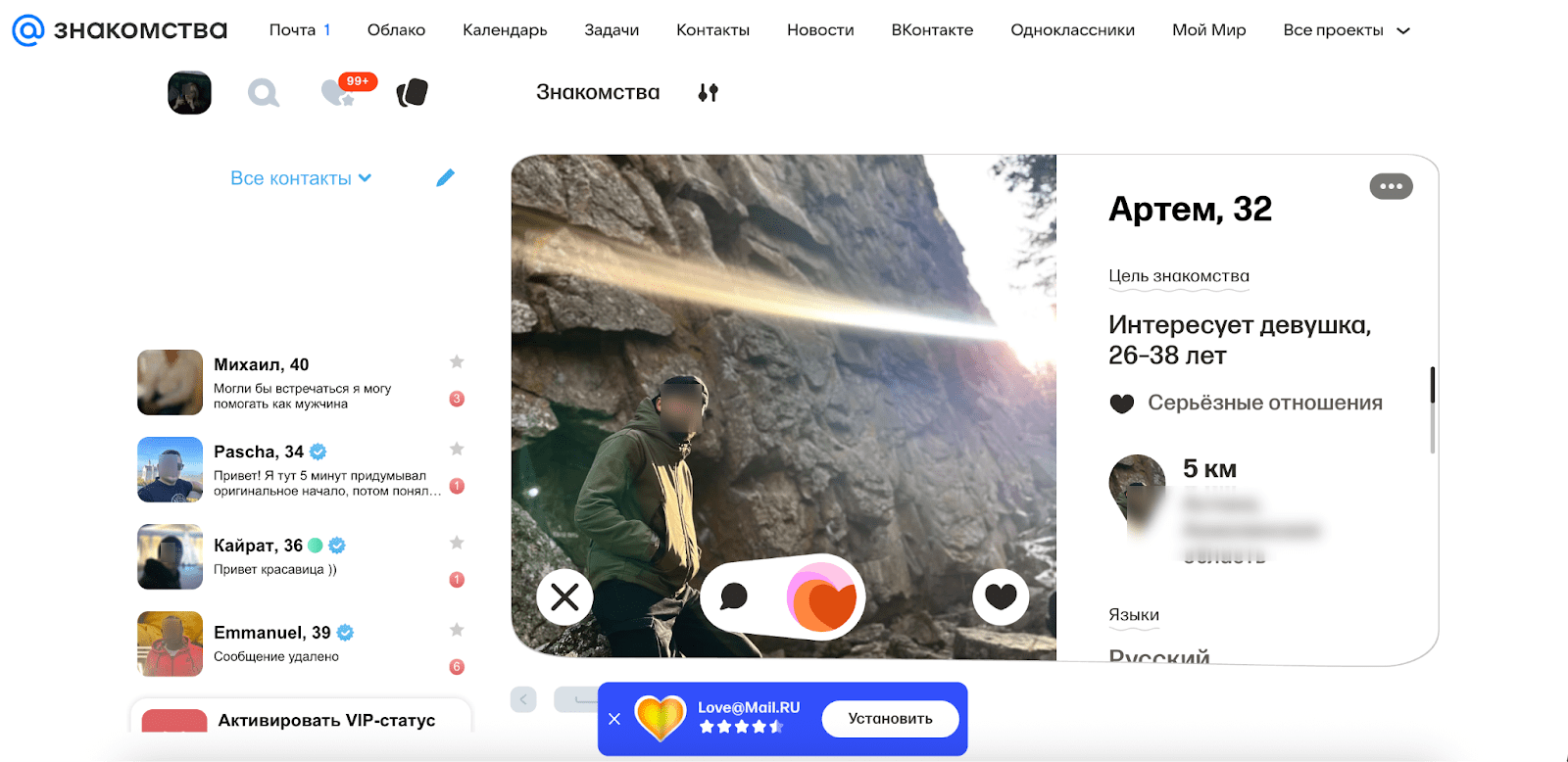 Love.mail.ru — сервис от Mail.ru Group, где ботов меньше, чем живых динозавров. Каждая анкета проходит допрос с пристрастием — никаких фейков и мошенников, только настоящие люди в поисках счастья.