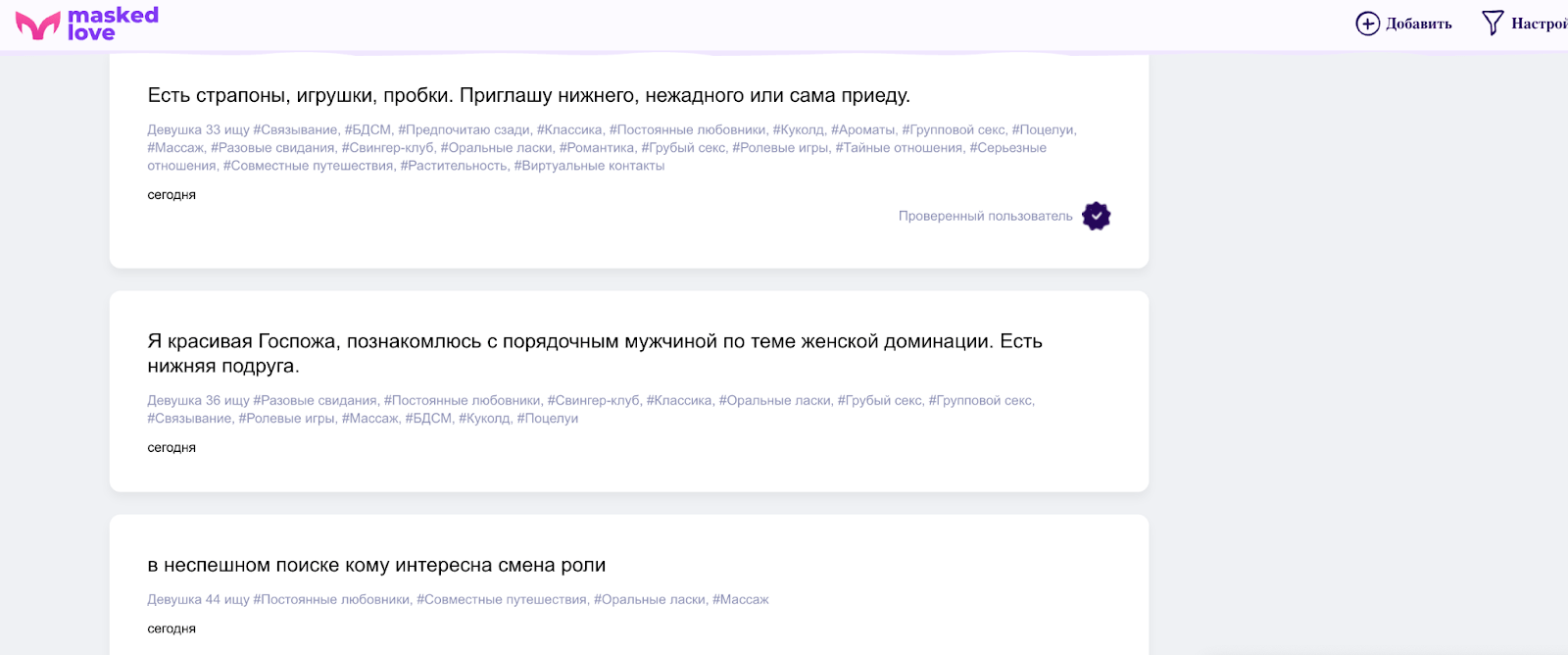 Серьёзные отношения или лёгкое общение? Поиск супруга или приятной компании? Masked.Love и Teamo подходят для долгосрочных планов, Pure и "Без комплексов" — для свободных встреч.