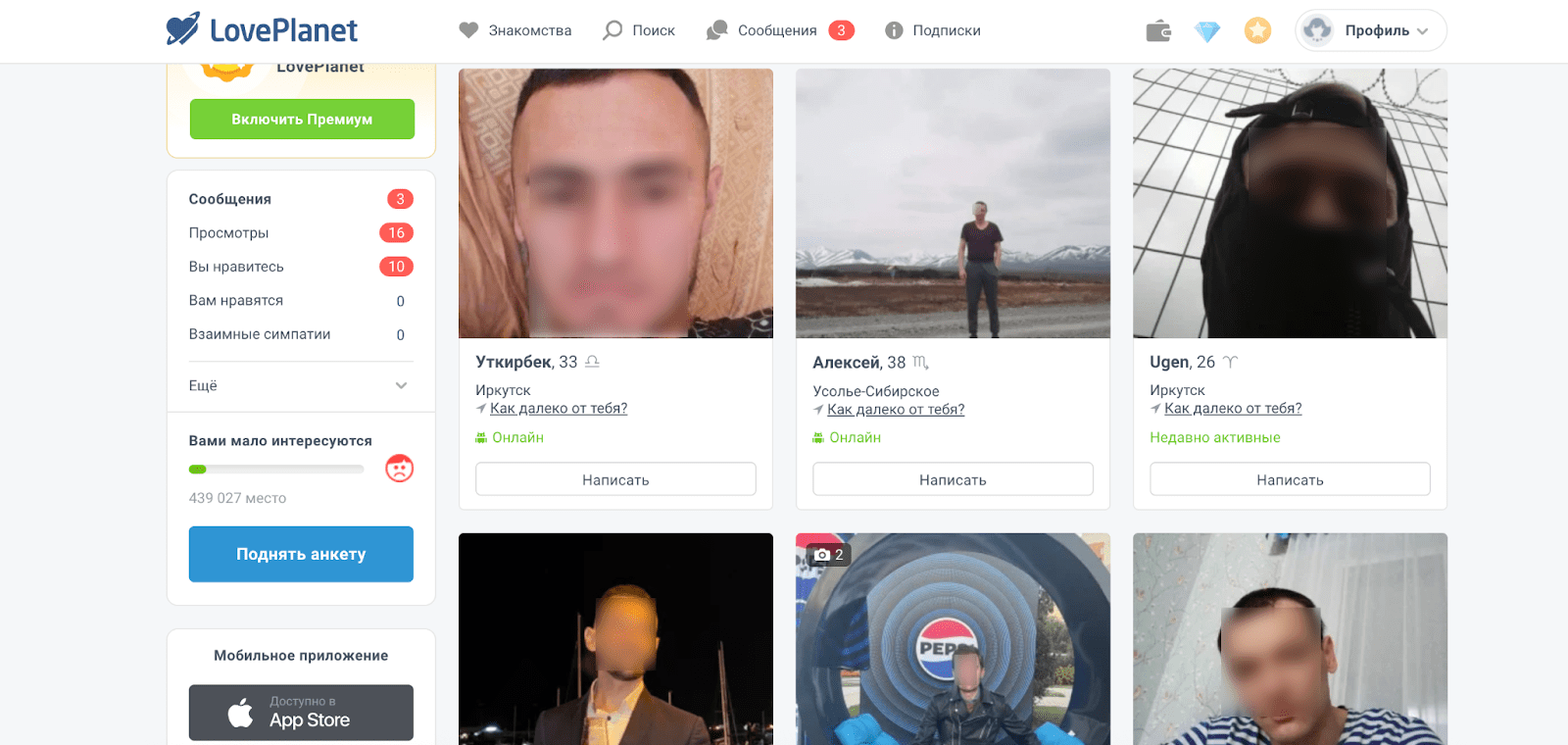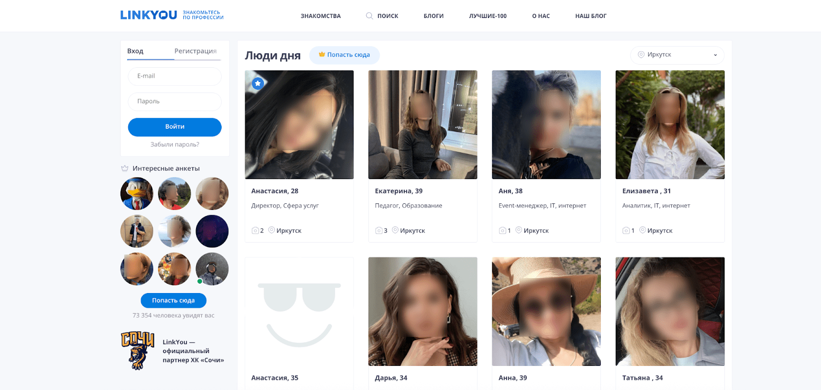 Аудитория состоит из думающих людей с высшим образованием. Ищут не только красивое лицо, но и родственную душу. Рейтинг сайтов знакомств в Иркутске не обходится без этого научного подхода. За качество придётся доплатить.