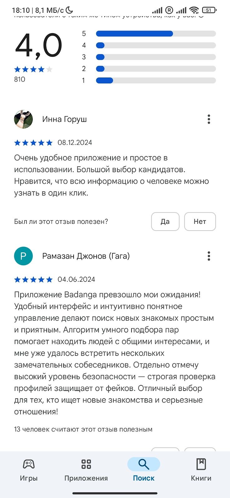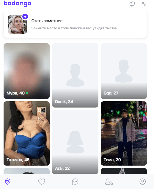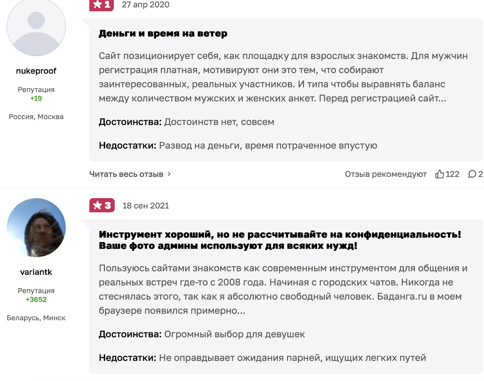 Мне показалось, что попытка завязать знакомство на Badanga - пустая трата времени и сил. Модерация отсутствует, мало активных и реальных пользователей, по-нормальному возможно использовать только приложение. Я не нашла отклика, как будто там никого нет. К тому же, некоторые пользователи в отзывах рассказывали, что их фото сливали, они потом находили себя по всему интернету. Для меня это тревожный звоночек.