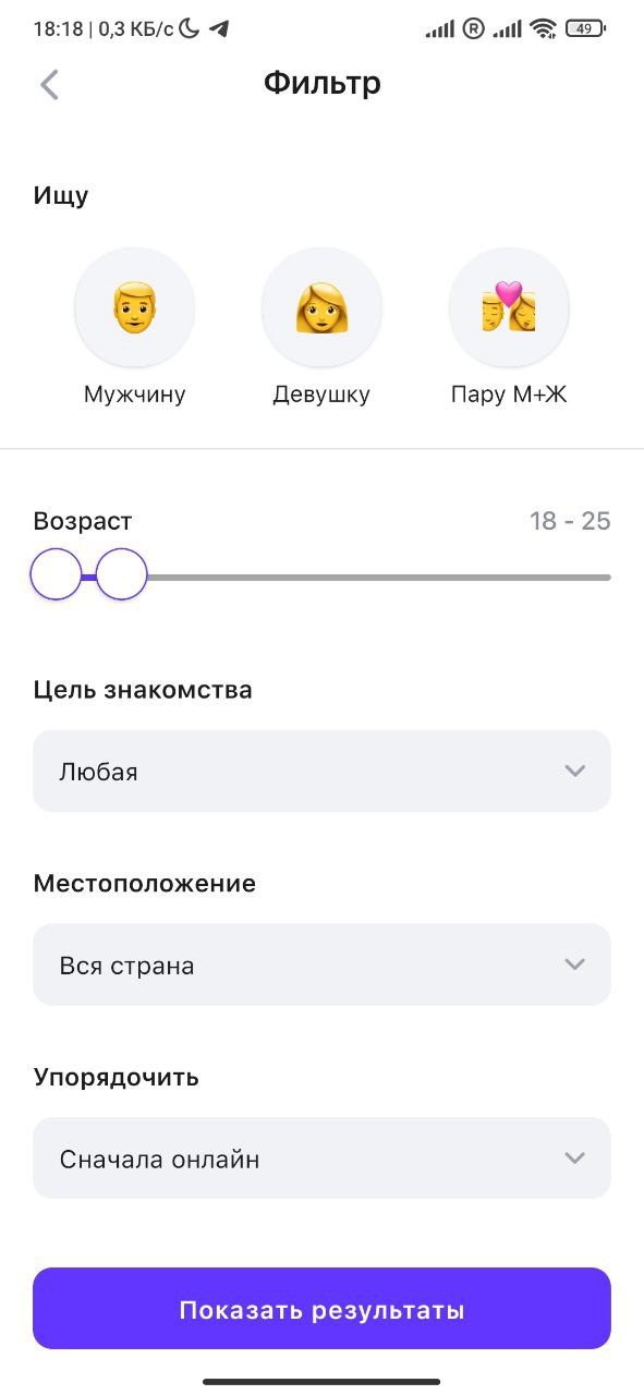 • Поиск: Минимальные настройки — выбираете регион, пол и возраст и ставите лайки.