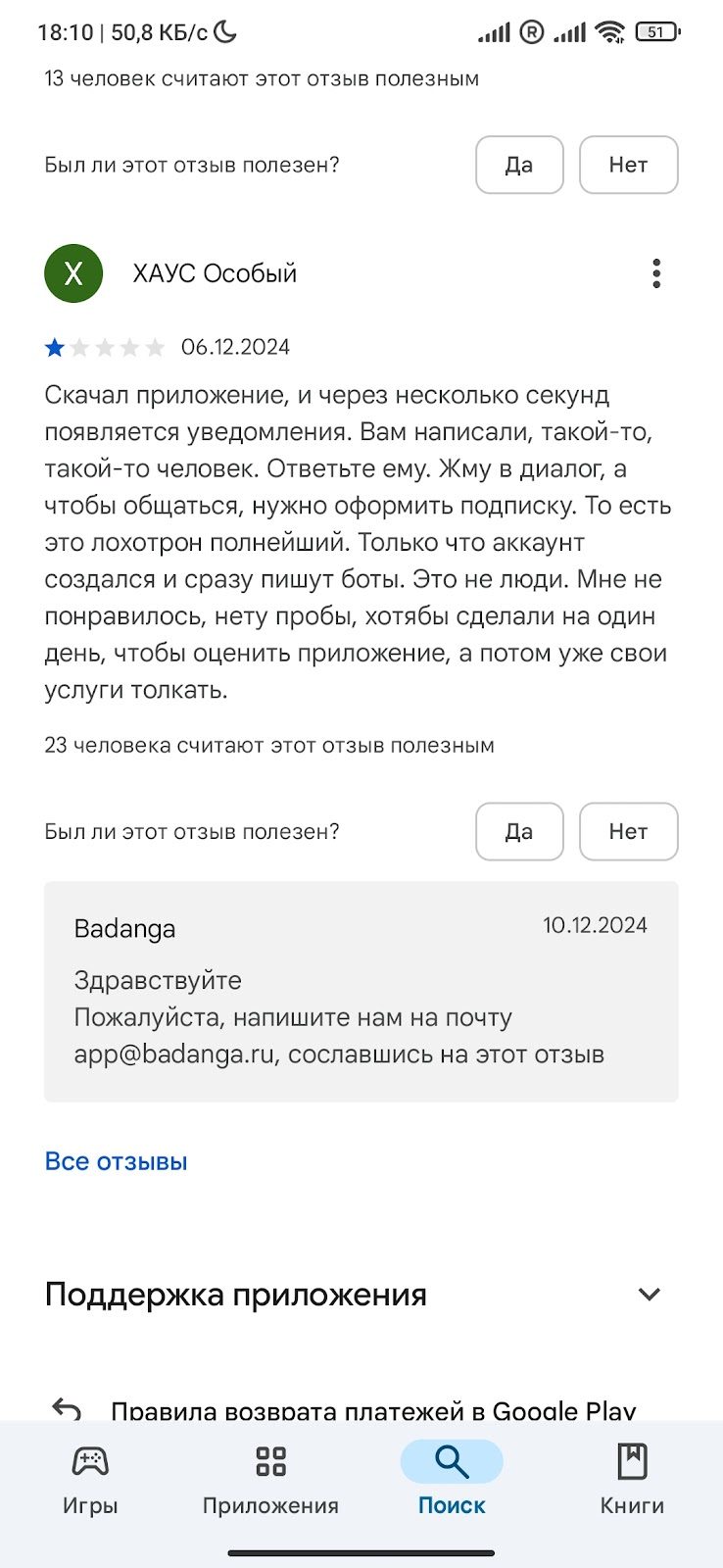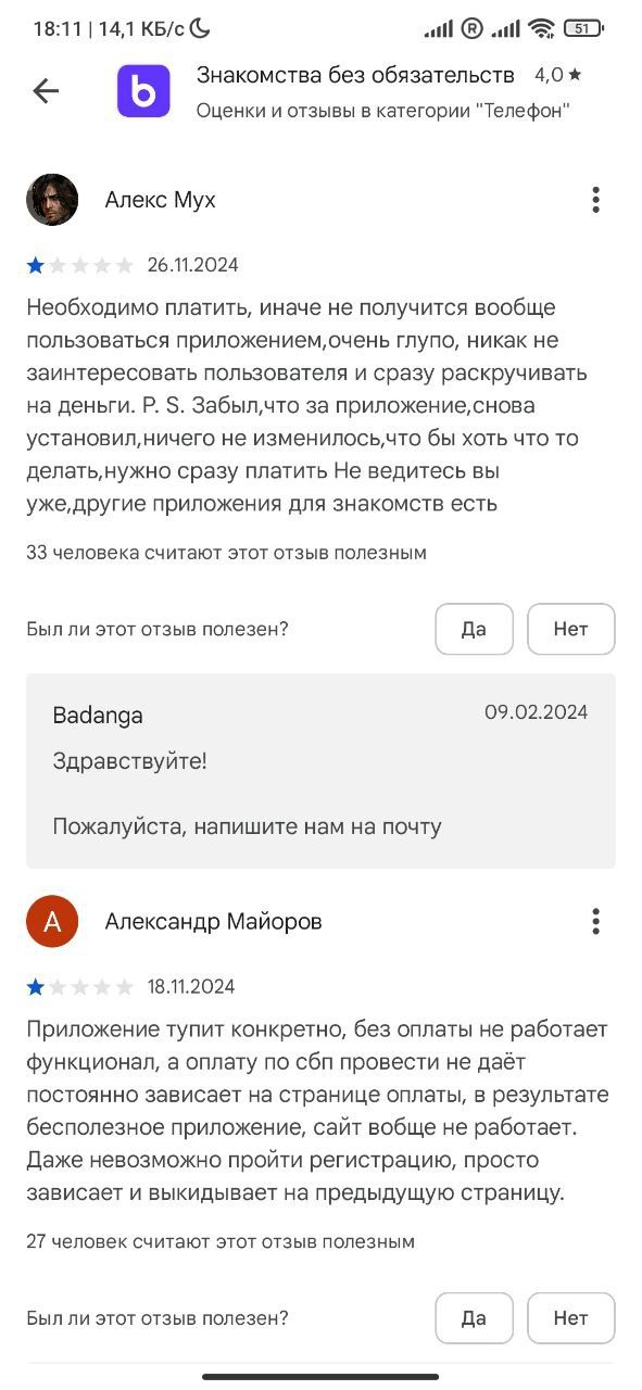 Отзывы на Badanga разнятся. Как всегда, первые отклики в магазине приложений идеальные, все расхваливают как тут удобно и просто. Но заходишь чуть дальше и встречаешь негатив. В частности, жалуются на отсутствие сайта, кучу ботов и сложности с оформлением подписки. Здесь, как нигде, придется быть внимательным, чтобы найти для себя подходящую пару.
