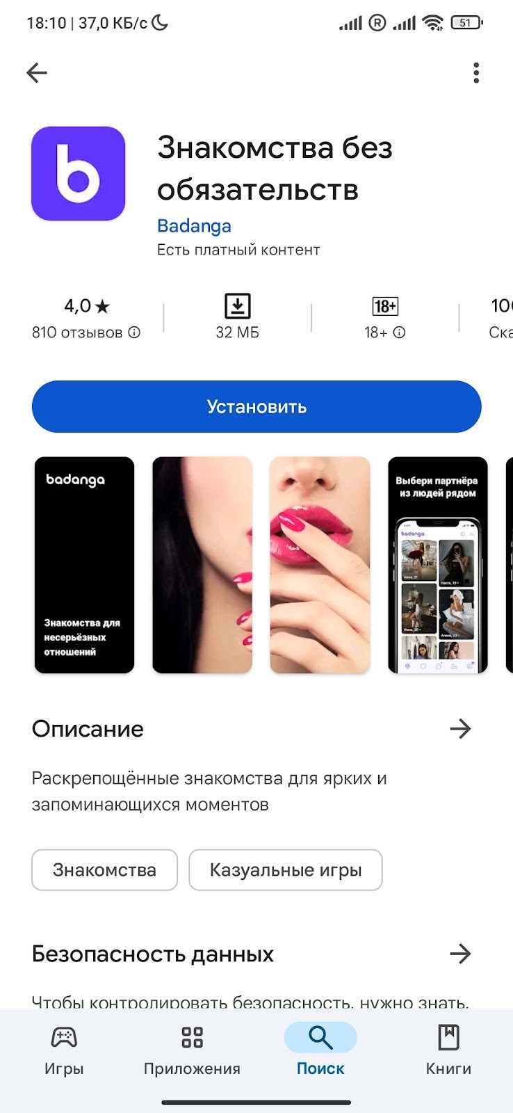 Что за Badanga? Это место для тех, кто хочет расслабиться, пофлиртовать и найти новые знакомства. Здесь можно встретить как собеседников для приятного общения, так и людей, готовых к чему-то более серьёзному — всё зависит от вашего настроя. При этом чаще всего приложение используется для поиска секса.