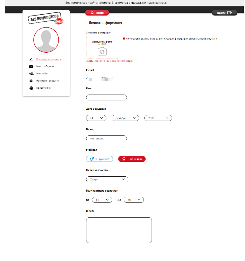 - Анкета: все критерии, которые надо (ну или желательно) заполнить указаны на скрине выше. Никаких интересных вопросов, никто не полюбопытствует есть ли у вас определенные кинки или хотя бы супруг и дети. Скудно и скучно по сравнению с современными аналогами. Что за “Без Комплексов”, если никто даже не делает вид, что мы интересуем создателей? Почему бы не спросить о наших сексуальных предпочтениях, к примеру?