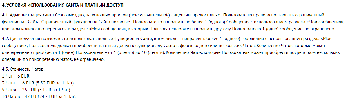 Платная функция всего одна: продолжение чата. С огромным трудом я нашла стоимость, она прописана в огромном документе под названием "Пользовательское соглашение". Со стороны женского аккаунта нет никакой возможности оплатить подписку.