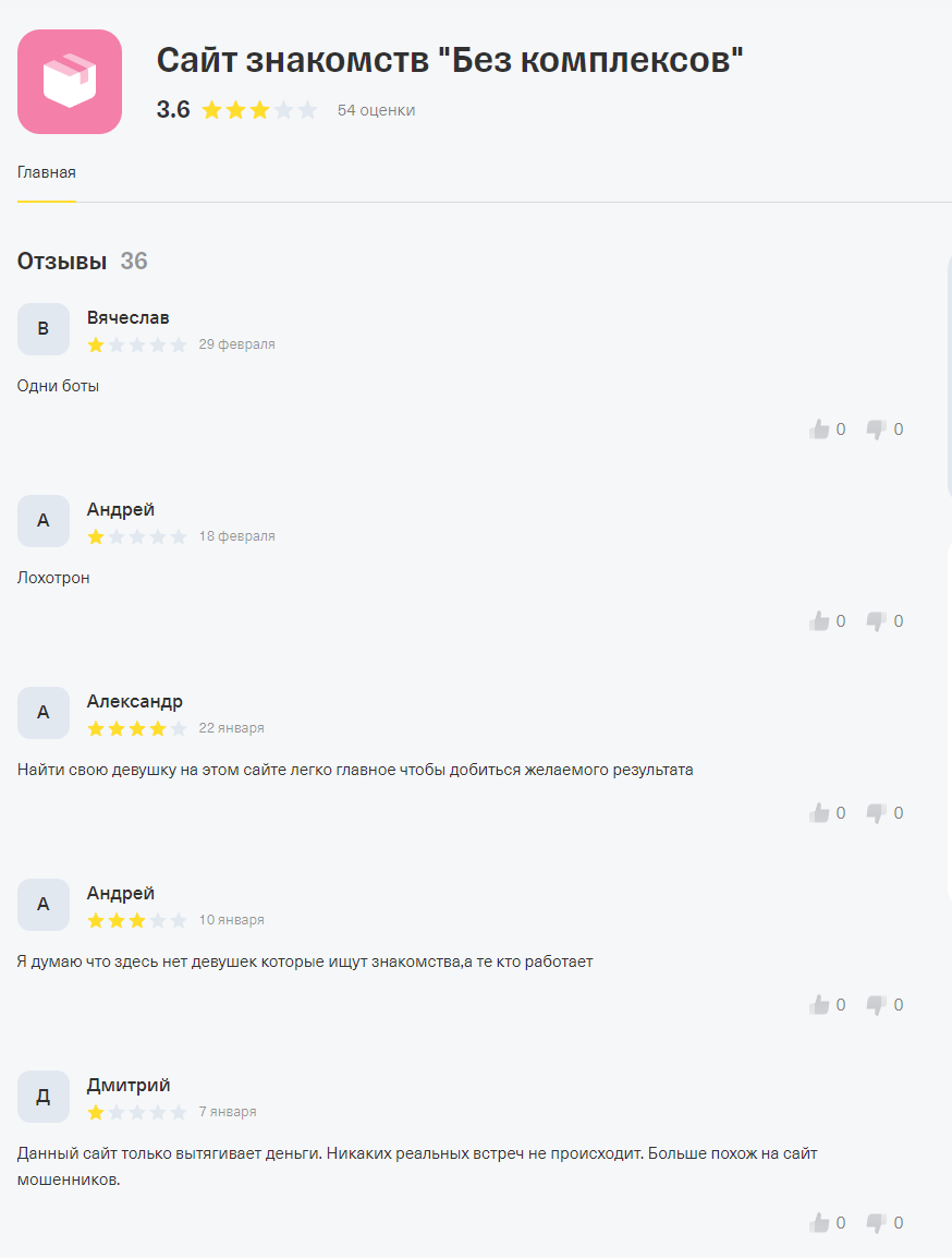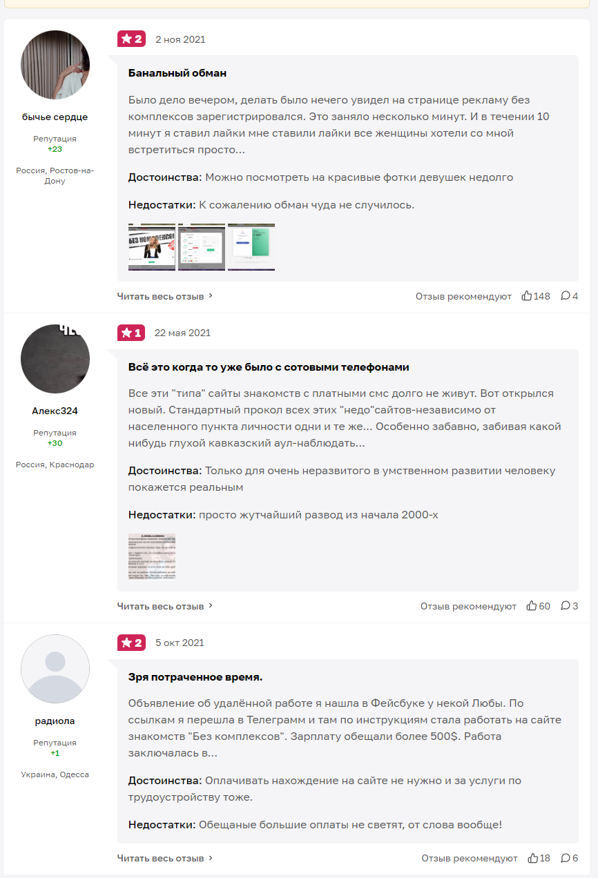 Отзывы о платформе «Без комплексов» говорят сами за себя, повторюсь лишь еще раз — это НЕ сайт для знакомств. Здесь нет реальных девушек, а если есть, то делают также как я: не встречая никакого отклика со стороны мужчин, просто уходят спустя несколько дней, потому что боты намного активнее.