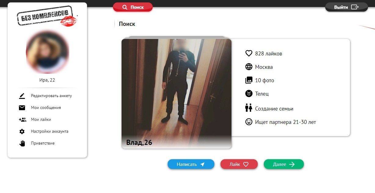 Как работает сайт Без Комплексов? Мне тоже интересно как, потому что более примитивного и неинтересного интерфейса я не видела с начала 2000-х годов. Весь сайт — огромный белый лист, где ты даже не можешь использовать какие-то фильтры для поиска и тебе потоком предлагаются анкеты. Их можно лайкнуть или пролистнуть. Если что, то вот эта замечательная красная кнопка “поиск” неактивна!
