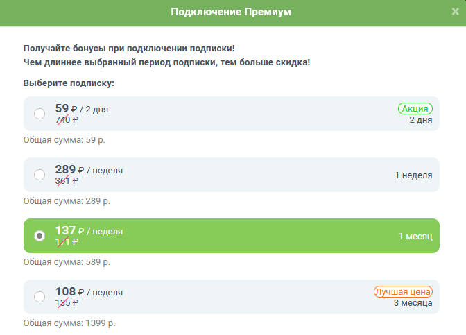 Мобильная версия работает аналогично. Бонус: иногда дают неделю премиума бесплатно. Правда, не всегда — зависит от настроения администрации.