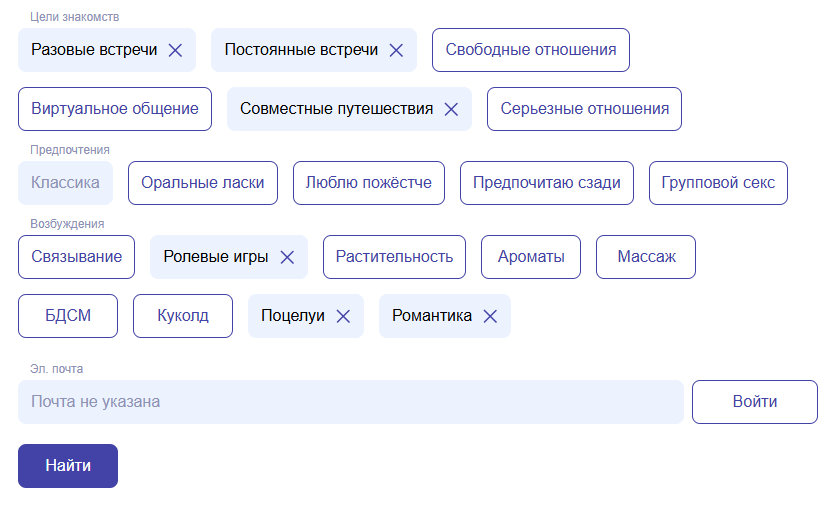 Далее указываете из предложенного набора цели знакомств, предпочтения, фетиши, которые вас возбуждают, и указываете почту.