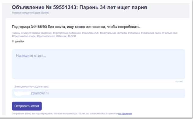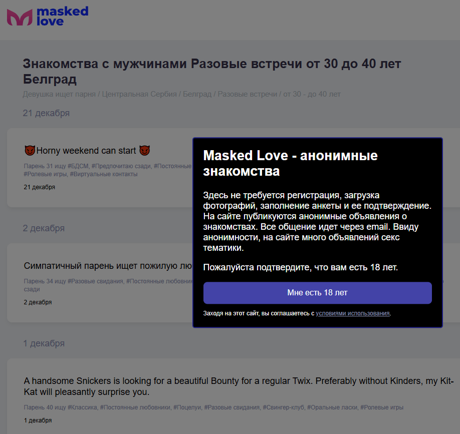 Как работает Masked Love? Я кликнула на один из линков и открыла объявления. Вот как выглядело одно из них.