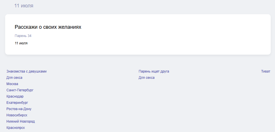 Самое раннее сообщение датируется 11-м июля. Ниже есть список городов для быстрого поиска по ним, а также пара разделов, видимо, с популярными для вашего города (или близкому к вашему) запросами.