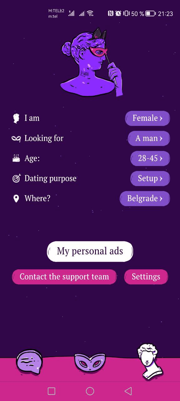 Если ваше местоположение определено неправильно, или вы просто хотите сменить город или другие параметры, заходите в настройки. На этой же странице можно написать в техподдержку, узнать больше о том, как работает Masked Love, если у вас остались вопросы.