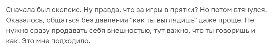 Отсутствие предрассудков: люди оценивают вас по словам, а не по внешности Честность: проще написать о своих истинных желаниях Безопасность: коллеги и знакомые никогда не узнают о ваших поисках Фокус на совместимости: важнее общие интересы, чем красивые фото