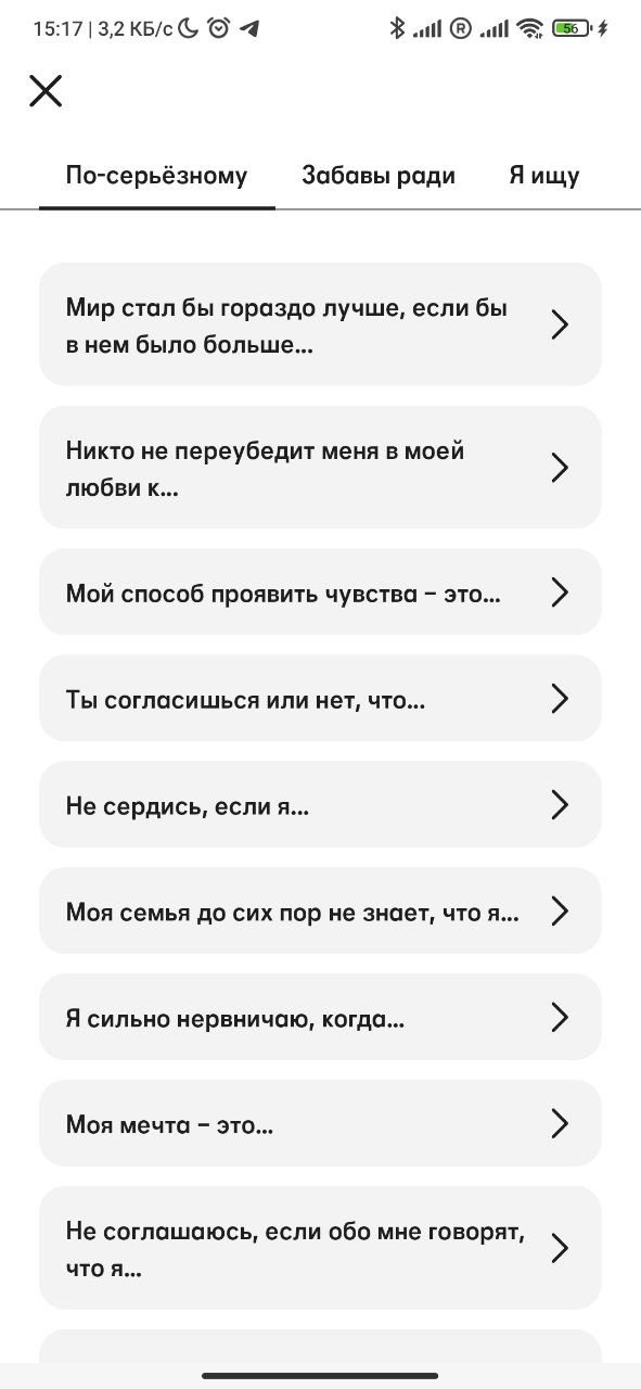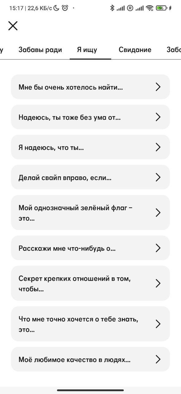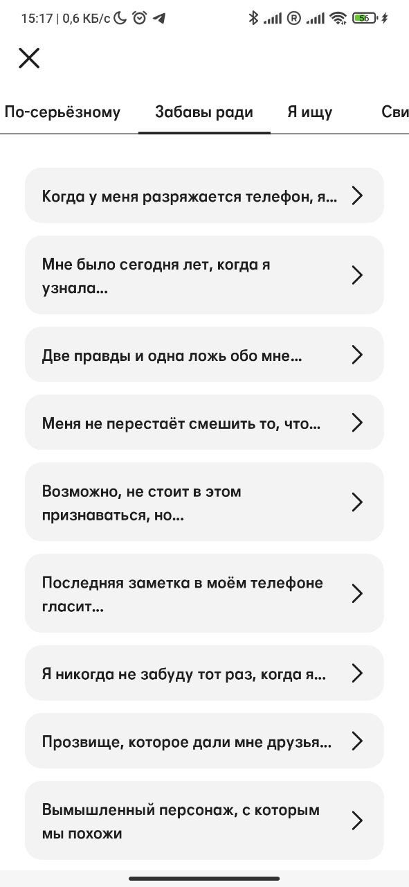 Подсказки для начала разговора Приложение предлагает стартеры для сообщений. Больше никаких "привет, как дела?" — теперь можно написать что-то оригинальное. Ну, или воспользоваться шаблоном, притворившись креативным.