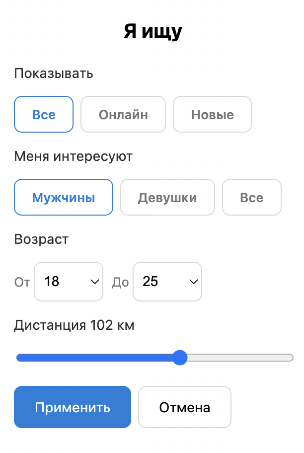 • Фильтры поиска: Доступны лишь базовые параметры: возраст, пол, расстояние.