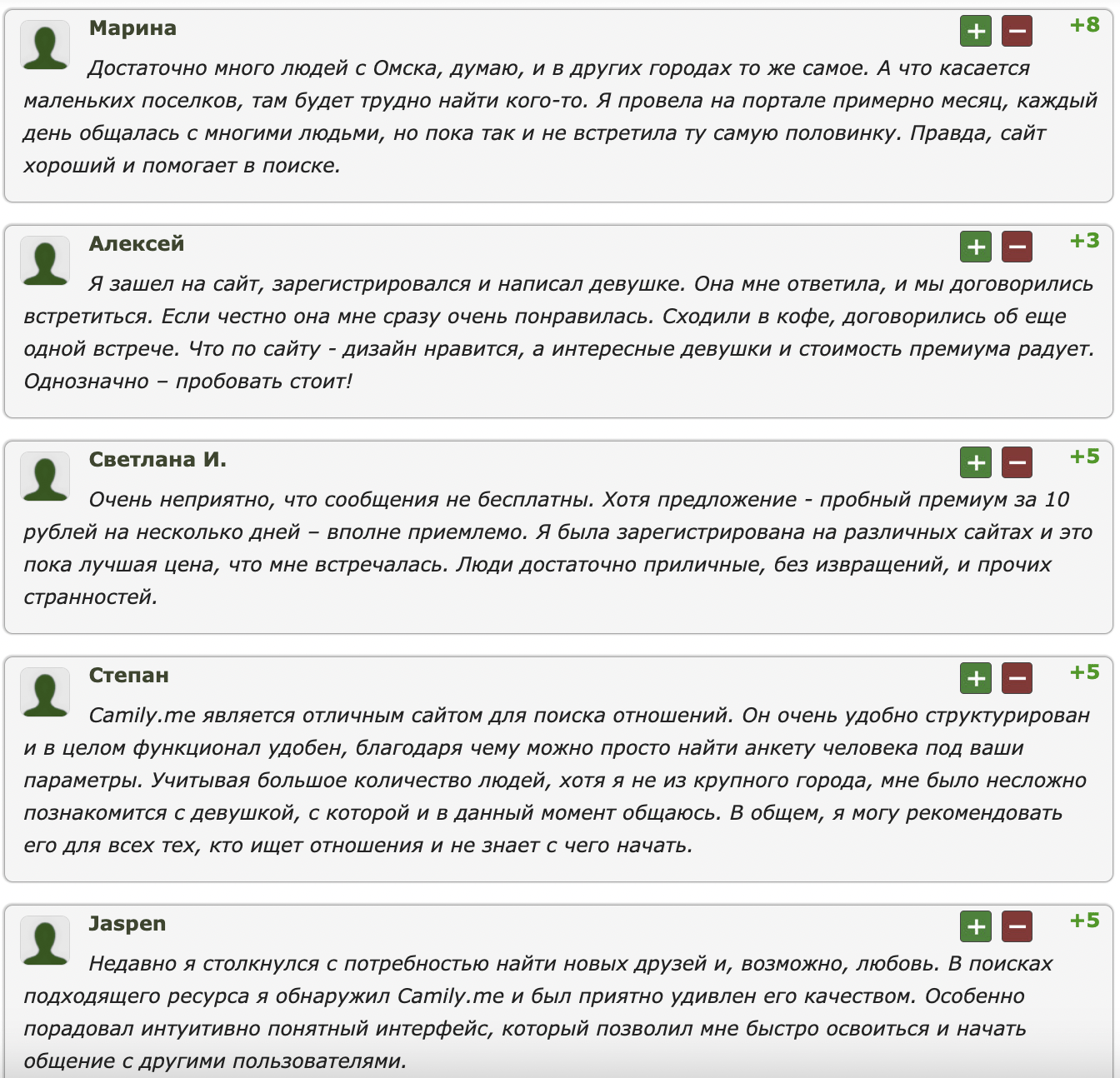 Найти отзывы на Camily сайт знакомств оказалось нелегкой задачей. Я обнаружила лишь один сайт с отзывами пользователей, но у меня много сомнений по поводу реальности этих комментариев.