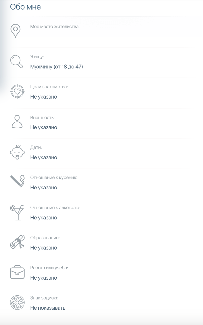 - Заполнение анкеты. Крайне формальный момент, потому что с одной стороны в анкете спрашивают какие-то ключевые моменты о вас. Но в то же время я не могу отметить свои особые предпочтения в поиске.