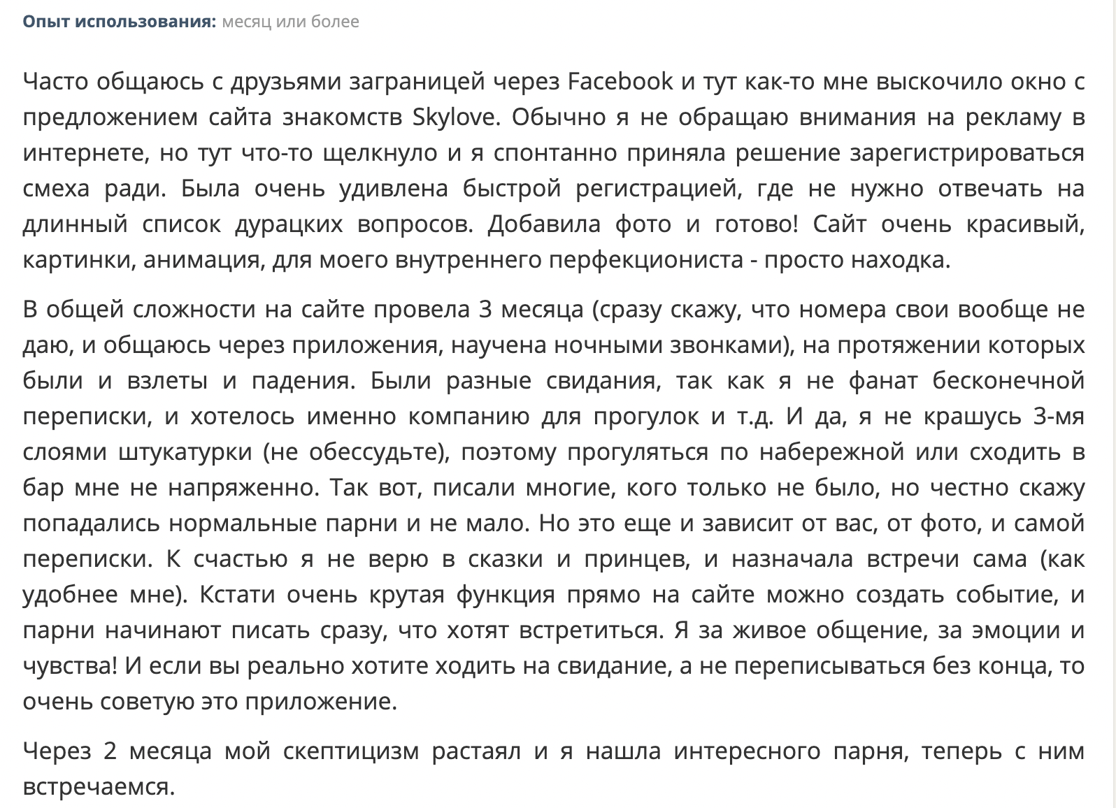 SkyLove сайт знакомств отзывы имеет заслуженно позитивные. Справедливости ради здесь действительно можно найти крутые знакомства. Рекламы тоже нет ни на сайте, ни в приложении, а реальных пользователей сильно больше фейков.