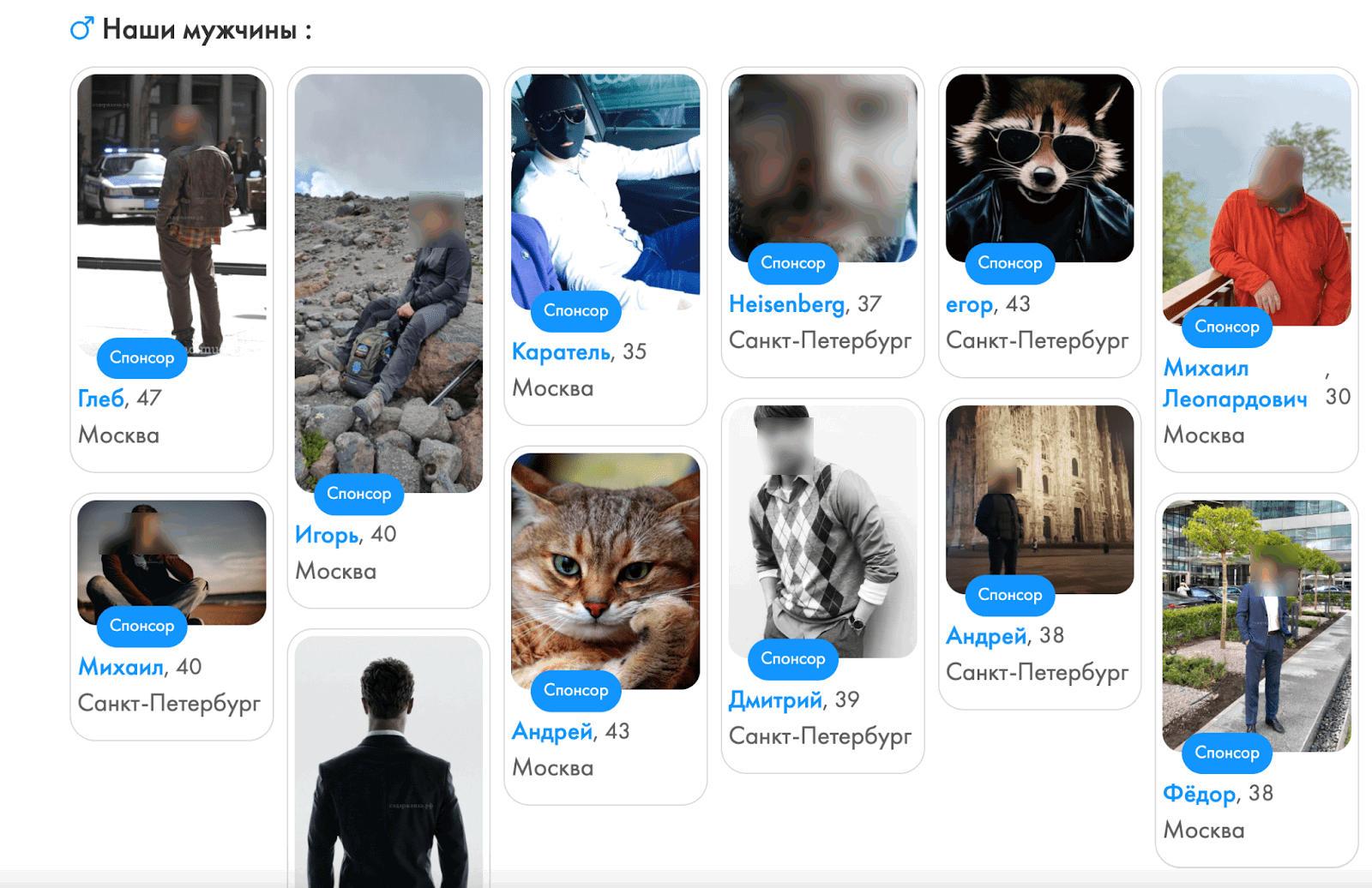 На главной странице вас сразу встретят закрепленные аккаунты: те, кто потратился на премиум. Как видите, здесь можно встретить не только людей, но и… котов и енотов? С фото здесь можно вообще не заморачиваться.