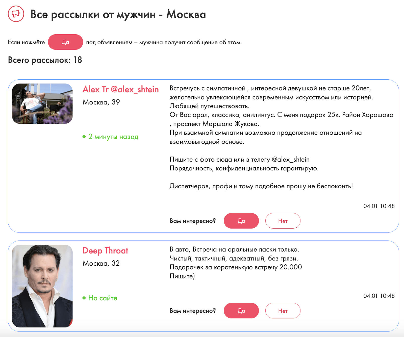 Спонсоры имеют доступ к автоматической рассылке сообщений всем девушкам по определенным регионам. Вот пример сообщений, которые я получила (как и сотни других). Обычно все прямолинейные и сразу пишут, кого ищут и чего от вас хотят. Справедливости ради, здесь встречаются совсем милые лапочки, которые ищут дружеские отношения. По крайней мере, так заявляют.