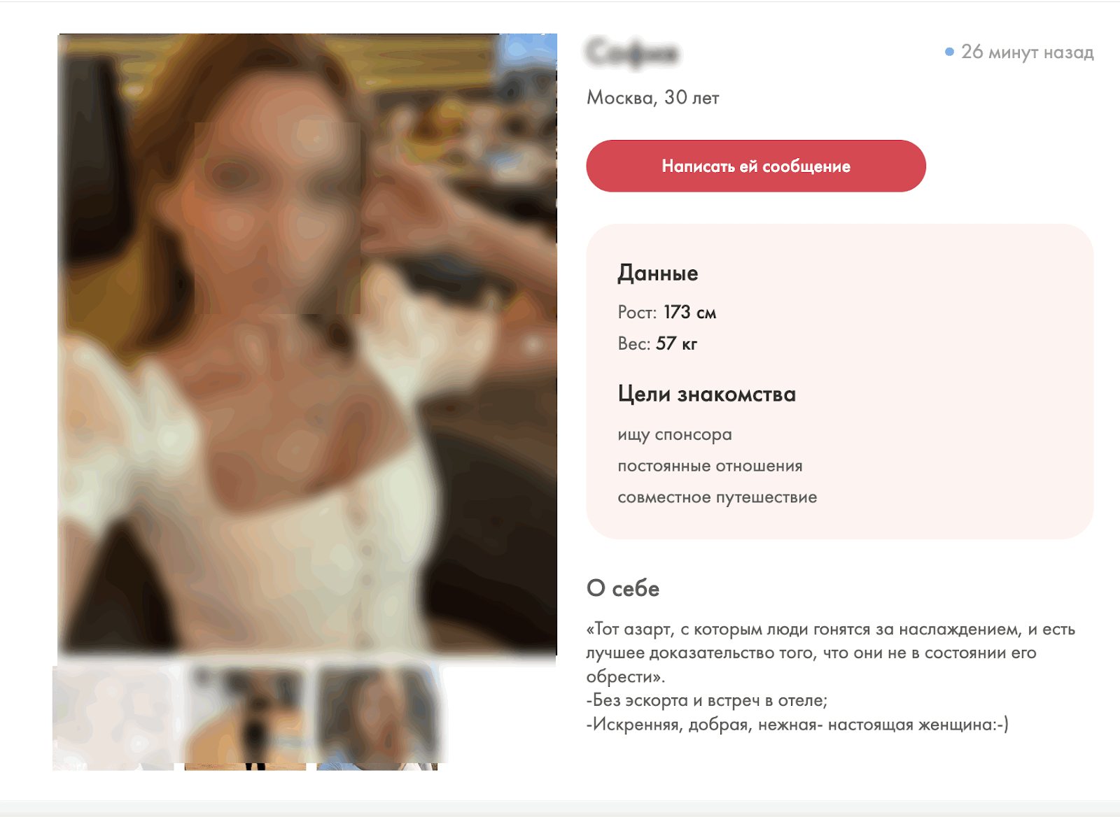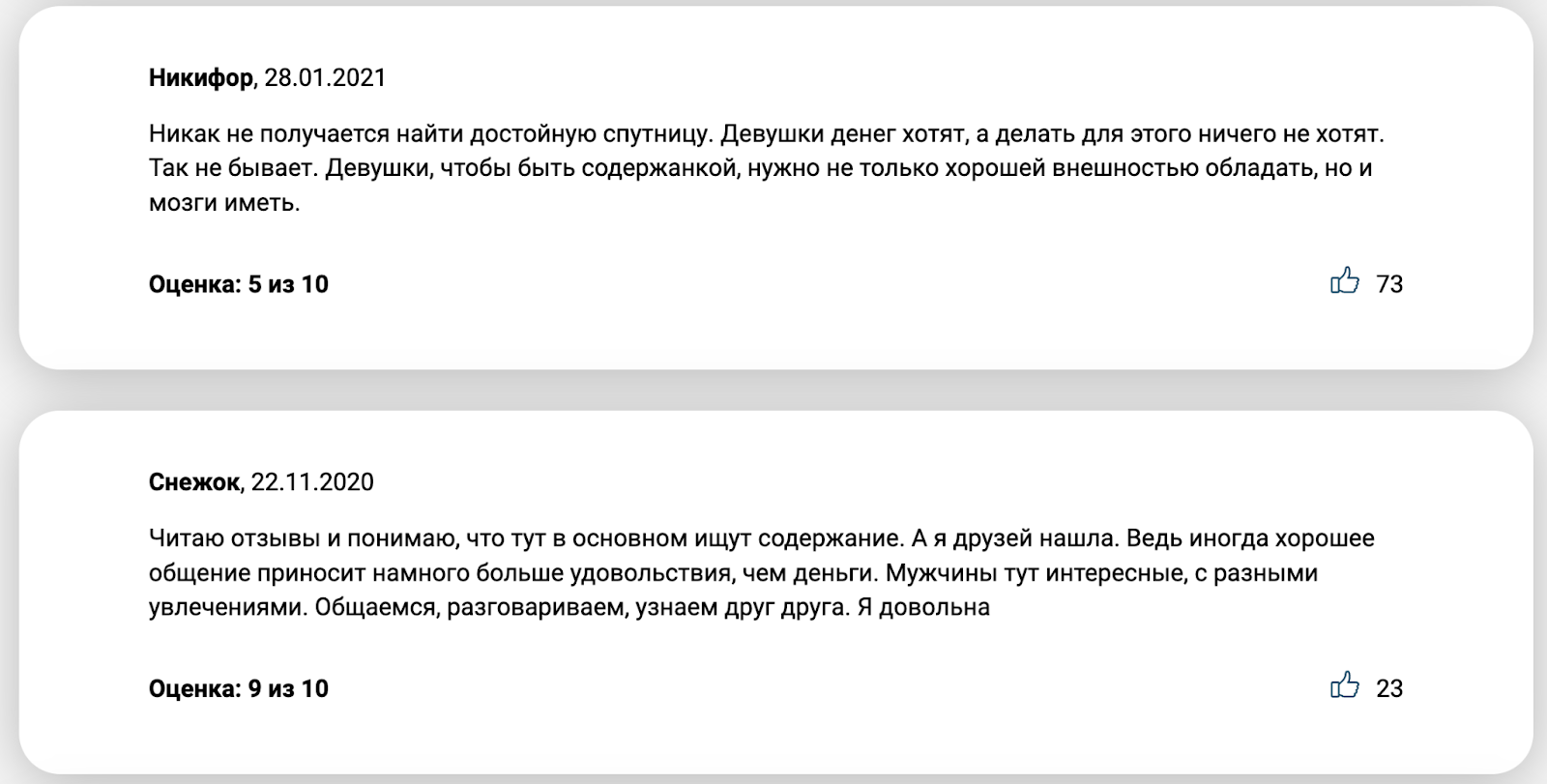 По своим ощущениям могу сказать, что восторга от общения я не ощутила. Практически никто не ответил, а те, кто отвечал, требовали от меня десятки фотографий со всех ракурсов. Верификация номера обязательна, что снижает количество фейков, но не защищает от них вовсе. Модерация нулевая. Ощущение, что Содержанка.рф работает как рынок, где ты товар один из сотни других. Я хоть и фанатка экспериментов, но не могу назвать себя целевой аудиторией.