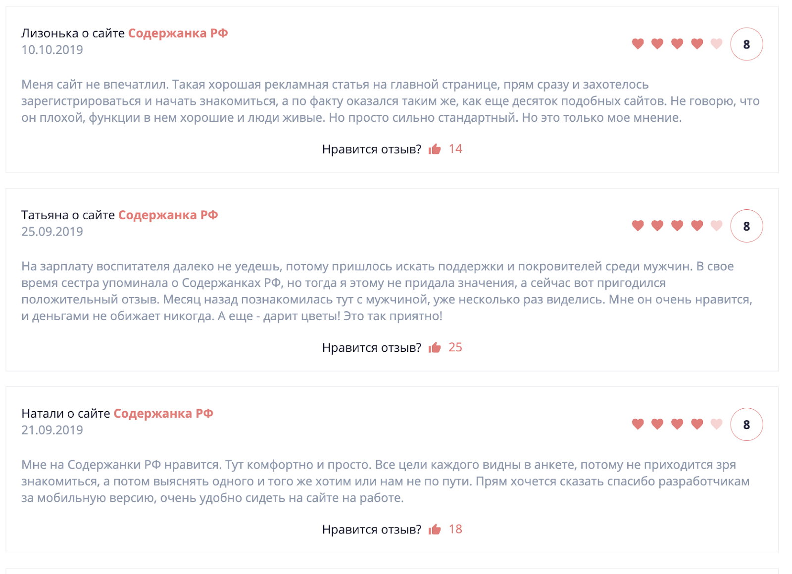 Содержанка.рф — это как дорогой ресторан с завышенными ожиданиями. Вы приходите, чтобы ощутить роскошь, но вместо фуа-гра вам с пафосом подают бутерброд. Здесь предлагают быстрые знакомства, но за деньги. И отличную модерацию - но тоже за деньги. Вообще всё за деньги, поэтому сайт полностью оправдывает свое название - вот кто главная “содержанка”.