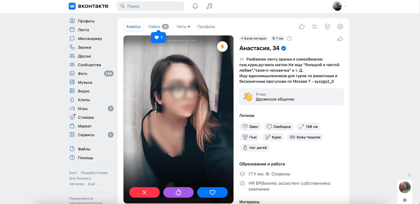 Формат взаимодействия привычный для современных людей. Свайпы, лайки, короткие сообщения. Аудитория здесь не так велика, как на других сайтах. Но это даже плюс — меньше конкуренции! Практически все профили настоящие, так как они привязаны к действующим аккаунтам социальной сети.