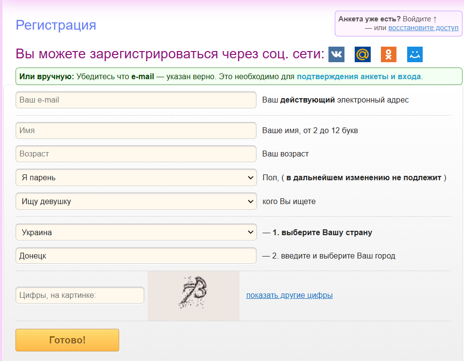 Как зарегистрироваться в PrivatMeet? Проще простого! Хотя можно войти через соцсети, я выбрала регистрацию по email — все-таки такие знакомства лучше держать подальше от любопытных глаз коллег и родственников. Указала: