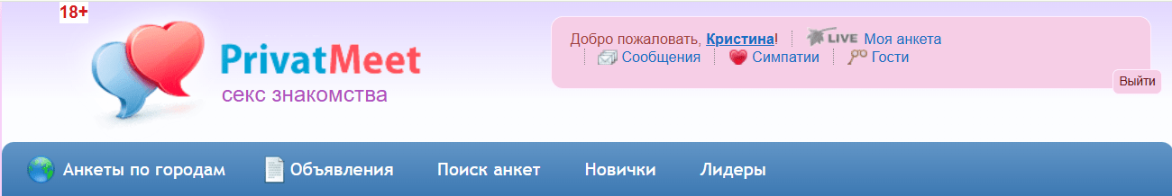 После регистрации я сразу поняла, что такое PrivatMeet знакомства на самом деле. Это территория свободных взрослых людей, где не нужно ходить вокруг да около. Все предельно честно — никто не притворяется. Тут никому не нужна «дружба» и «поговорить» — только интим, причем в разных его проявлениях… ну как ты хочешь в своих секс-фантазиях… Тут встречаются состоявшиеся люди 25+, которые точно знают свои желания и не боятся о них говорить, а тем более не боятся их воплощать в жизнь с единомышленниками, с которыми еще пару дней назад были не знакомы.